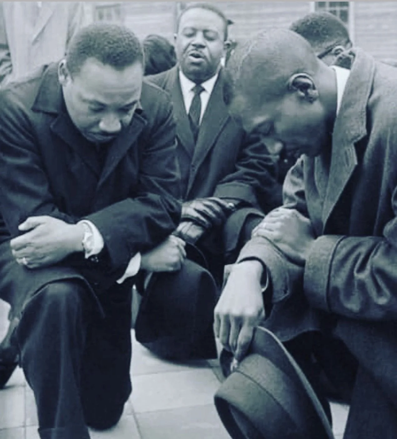 Dr. King and fellow civil rights activists taking a knee in prayer.