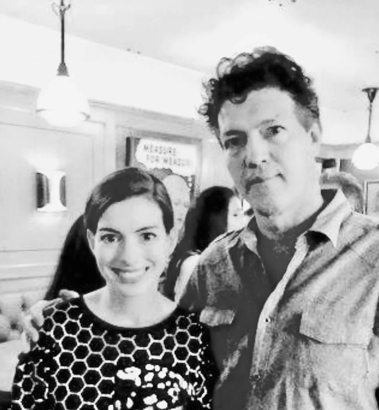 Just had dinner with George Brandt and Anne Hathaway. George wrote a play called Grounded in which Anne stared.